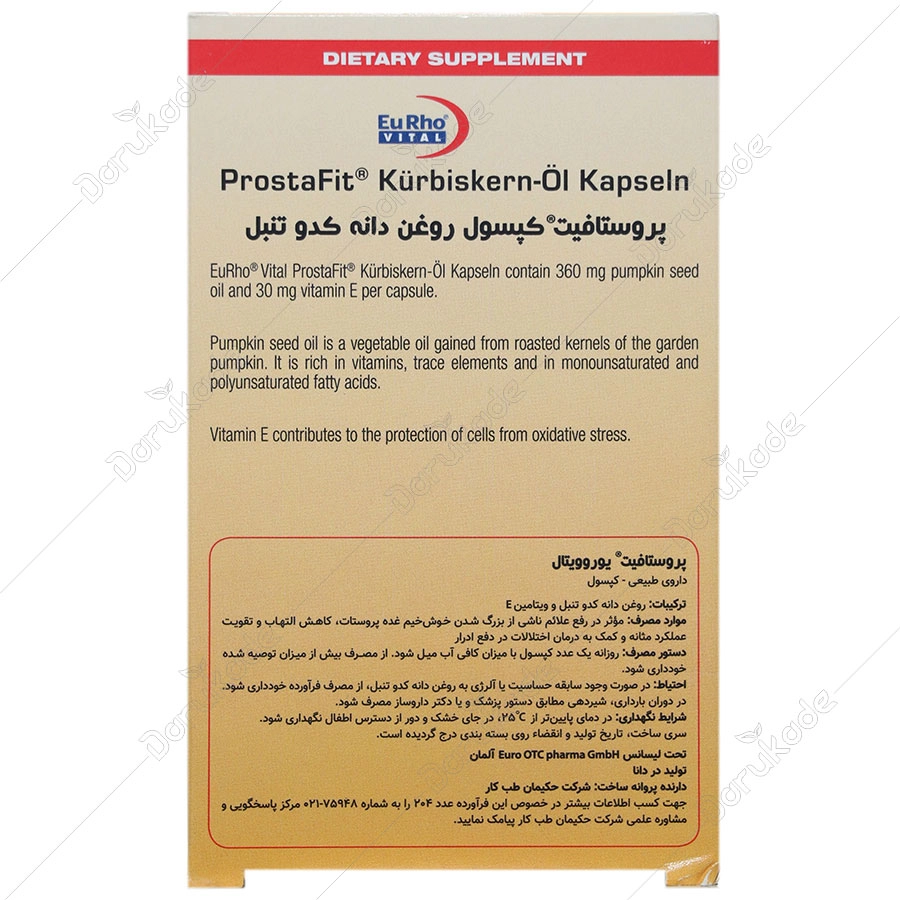 کپسول پروستافیت یوروویتال حاوی ترکیبات موثری چون روغن دانه کدو و ویتامین E است. روغن ارزشمند دانه کدو تنبل سرشار از ویتامینها، عناصر کمیاب و اسیدهای چرب اشباع شده و غیر اشباع است و برای حفظ سلامت پروستات فواید بیشماری دارد. ازآن طرف ویتامین E موجود در کپسول پروستافیت یوروویتال 60عددی در محافظت از سلولها در برابر استرس اکسیداتیو موثر است.